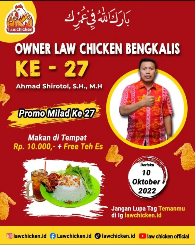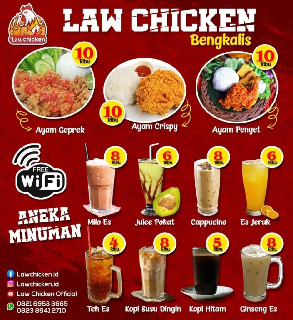 Kami adalah Resto Law Chicken pertama di Bengkalis, mengusung nama Law Chicken dengan Logo Ayam berapi-api sudah terdaftar dalam Hak Paten berbagai Menu Lezat disajikan dapat anda temui di sini. Pilih Level Pedasmu, semua menantangmu untuk mencoba. Tunggu apalagi Yuk pilih menu kesukaanmu. Pesan Ojek Online sangat bisa. Yuk Lanjut..